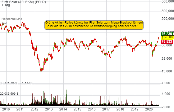 4.) Solar Stocks gehören am US-Markt zu den Favoriten. First Solar beginnt sich aus der Pivotal Base zu lösen.