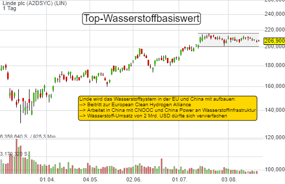 Die europäischen Staaten und China haben die Zeichen der Zeit erkannt, dass für eine Dekarbonisierung der Einsatz von Wasserstoff in der Mobilität und industriellen Prozessen notwendig ist. LINDE ist ein Top-Profiteur des Aufbaus der Wasserstoffsysteme. Wir spielen den Aufwärtstrend mit einer gehebelten Position (Echtgeld-Firmendepot).