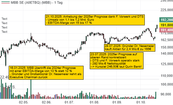 Mit der Aktie von Friedrich Vorwerk geht es am 22.10.2025 um weitere 4 % auf 104 Euro nach oben. Metzler erhöhte das Ziel auf 116 Euro und geht von einer zunehmenden Umsatzdynamik in den nächsten Jahren aus. Für MBB wäre das gut, weil man das Unternehmen konsolidiert. Damit würde auch das Umsatzmomentum der Beteiligungsgesellschaft ansteigen.