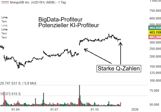 MongoDB überrascht die Wall Street mit einem deutlich aufgehellten Jahresausblick und belegt erneut, wie stark der Konzern vom globalen KI-Schub profitiert. Der Anbieter moderner Dokumentendatenbanken rechnet für das laufende Geschäftsjahr nun mit Erlösen zwischen 2,43 und 2,44 Mrd. USD – ein klarer Anstieg gegenüber der bisherigen Prognose (2,34 bis 2,36 Mrd. USD). Auch beim bereinigten Gewinn je Aktie hebt das Management die Erwartungen spürbar an und signalisiert, dass die Nachfrage nach KI-fähigen Datenbanklösungen weiter an Dynamik gewinnt. Laut Vorlage meldet MongoDB einen Umsatzanstieg von 19 %. Entscheidend für Anleger: Das Cloud-Produkt Atlas – die zentrale Wachstumsplattform des Unternehmens – liefert ein Plus von 30 % gegenüber dem Vorjahr und setzt damit ein starkes Signal für die kommenden Quartale.