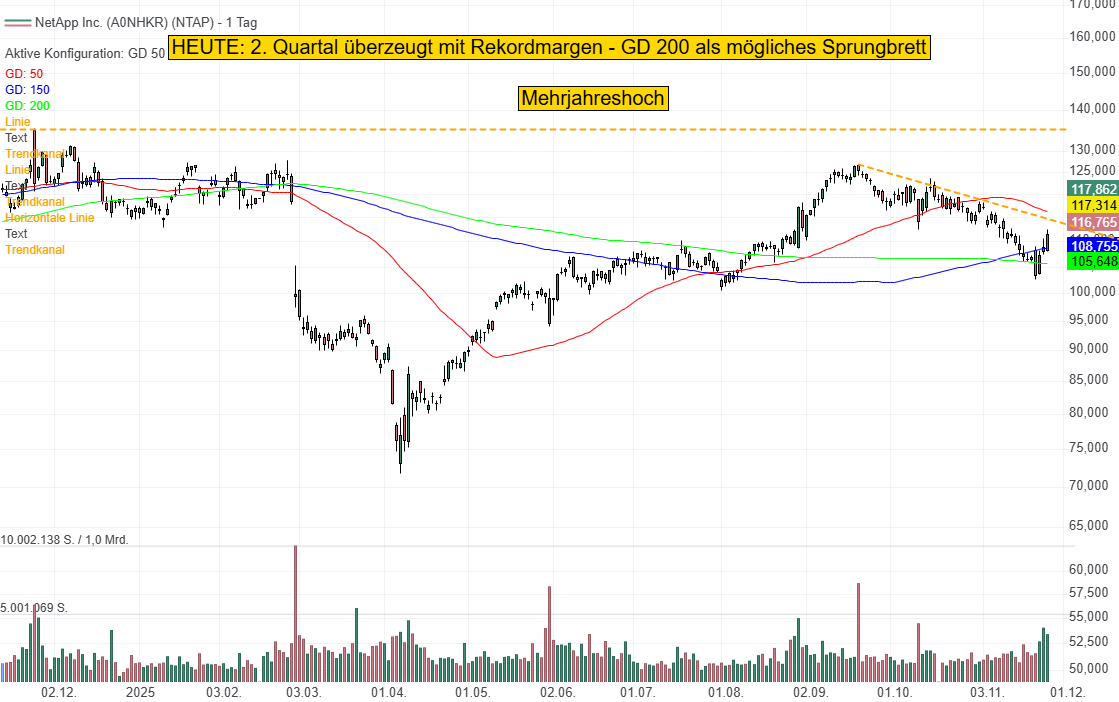 Gegen steigende Komponentenkosten hat sich NetApp mit fixierten Zusagen für die nächsten Quartale gut abgesichert. Die Bruttomarge und operative Marge erreichten im 2. Quartal neue Rekorde. Für neue Zuversicht sorgt insbesondere der von 7,60 bis 7,90 USD auf 7,75 bis 8,05 USD je Aktie angehobene Gewinnausblick für das Geschäftsjahr 2026, da der Analystenkonsens bisher vom unteren Ende ausgeht. Mit einem KGV von 14,7 scheint die Bewertung attraktiv zu sein. Charttechnisch könnte der GD 200 als Sprungbrett für neue Mehrjahreshochs dienen.