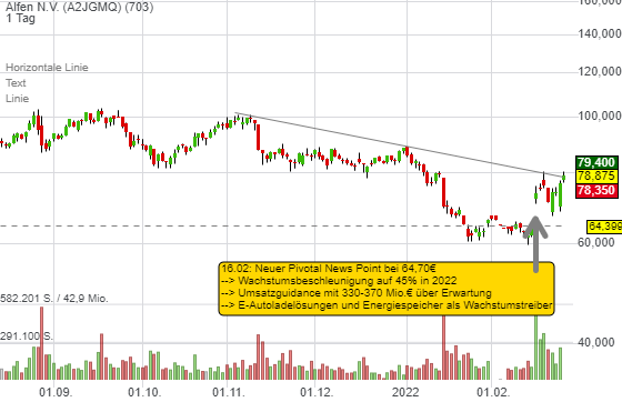 Vor wenigen Tagen bildete die Aktie einen Pivotal News Point! Alfen rechnet in 2022 mit einer Wachstumsbeschleunigung von 45% auf Erlöse von 330-370 Mio. Euro. Verantwortlich dafür ist eine höhere Nachfrage nach E-Autoladeinfrastruktur und Energiespeichern. Beispielsweise ist in England seit diesem Jahr bei neuen Gebäuden eine Ladeinfrastruktur verpflichtend.