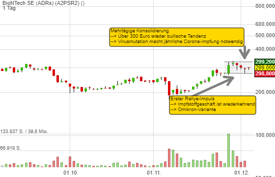 Die Biontech-Aktie hat nach der Rallye von Ende November gut eine Woche konsolidiert. Sie könnte nun ein Swing Trading Long-Signal aktivieren, wenn sie über 300 Euro steigt. Der Pullback müsste abgeschlossen sein. Es ließe sich mit einer Risikotoleranz auf Schlusskursbasis bis 270 Euro arbeiten – die Vola ist sehr hoch.