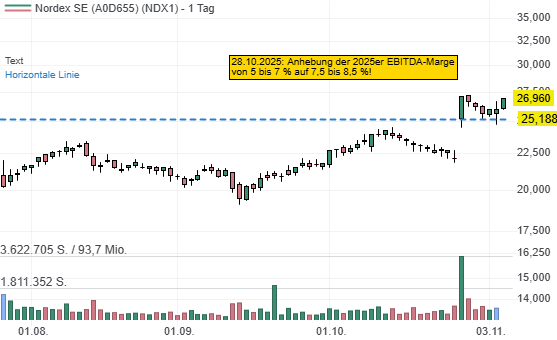 Einer der neuen Favoriten am deutschen Markt der Institutionellen ist der Windkraftanlagenbauer Nordex. Denn das Unternehmen hob vor wenigen Tagen die Prognose an. Die EBITDA-Marge wird bei 7,5 bis 8,5 % statt 5 bis 7 % erwartet. Damit realisiert man die mittelfristige Guidance von 8 % bereits in diesem Jahr. Das drückte die Aktie auf ein neues 52-Wochenhoch.