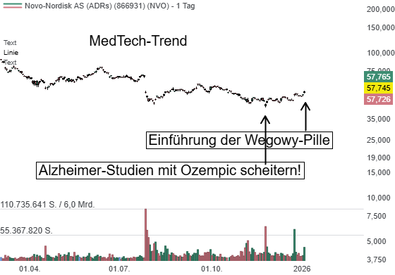 Der Kampf um die Vorherrschaft im boomenden Markt für Abnehmpräparate tritt in eine neue, entscheidende Phase. Novo Nordisk hat am Montag (05.01.26) offiziell den Verkauf einer Tablettenversion seines Blockbusters Wegovy in den USA gestartet und setzt dabei auf eine aggressive Preisstrategie, um verlorene Marktanteile zurückzuerobern. Mit einem Einstiegspreis von 149 USD pro Monat für Selbstzahler (Cash-Pay) zielt das Unternehmen direkt auf preissensible Konsumenten und versucht, dem Hauptkonkurrenten Eli Lilly zuvorzukommen. Für Anleger ist dies ein kritisch wichtiger Moment: Nachdem die Aktie von Novo Nordisk seit Mitte 2024 um mehr als 60 % korrigiert haben, hofft das Management unter neuer Führung auf eine Trendwende.