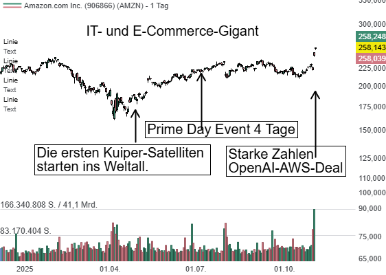 OpenAI, der Hersteller des führenden KI-Modells ChatGPT, hat mit Amazon (i) eine mehrjährige Cloud-Computing-Vereinbarung im Wert von 38 Mrd. USD getroffen, um seinen massiven und rasant wachsenden Rechenleistungsbedarf zu decken und damit seine ambitionierten KI-Entwicklungsziele voranzutreiben. Im Rahmen der Vereinbarung wird Amazon Web Services (AWS) OpenAI umgehend mit Cloud-Diensten versorgen und dem Startup Hunderttausende von NVIDIA-Grafikprozessoren für das Training und den Betrieb seiner Modelle zur Verfügung stellen. Die vollständige Kapazitätsbereitstellung ist bis Ende 2026 geplant, mit der Option auf weitere Expansionen ab 2027. Dieser Deal ist ein wichtiger Schritt für AWS im hart umkämpften Cloud-Markt, da Rivalen wie Microsoft und Google zuletzt höhere Wachstumsraten im KI-Segment verzeichneten. Für OpenAI, das sich nach einer Umstrukturierung von seinen gemeinnützigen Wurzeln löst und Gerüchten zufolge einen Börsengang mit einer möglichen Bewertung von bis zu 1 Bio. USD vorbereitet, ist dies eine von mehreren Cloud-Verpflichtungen, die nun fast 600 Mrd. USD umfassen, einschließlich größerer Verträge mit Oracle (300 Mrd. USD) und Microsoft (250 Mrd. USD). Die Ankündigung unterstreicht den enormen KI-Computing-Hunger der Branche und lässt die Amazon-Aktie erneut anspringen.