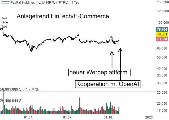 Die Aktie von PayPal (i) springt am 28. Oktober dynamisch an, nachdem das Unternehmen eine weitreichende Partnerschaft mit OpenAI bekanntgegeben hatte. Künftig können Nutzer von ChatGPT Einkäufe direkt über ihr PayPal-Wallet abwickeln – ein Schritt, der das Potenzial hat, die Schnittstelle zwischen künstlicher Intelligenz und Onlinehandel grundlegend zu verändern. Gleichzeitig soll PayPal sein globales Händlernetzwerk mit der ChatGPT-Plattform verknüpfen, sodass Millionen von Händlern künftig direkt innerhalb des KI-Chatbots ihre Produkte anbieten können. Nach Angaben von OpenAI nutzen bereits mehr als 800 Mio. Menschen pro Woche ChatGPT – für PayPal bedeutet dies Zugang zu einer der größten digitalen Nutzerbasen weltweit.