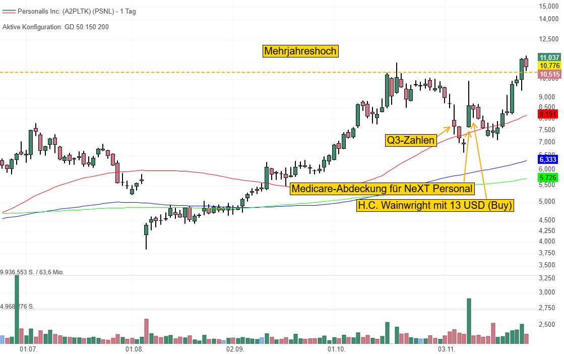 Am 10. November konnte die Medicare-Erstattung für die Überwachung bei Brustkrebspatienten im Stadium II und III gesichert werden. Eine Studie zeigte bereits auf, dass der Test sämtliche Patienten mit einem Krebsrezidiv ganze 15 Monate bis 5 Jahre früher erkennen konnte als herkömmliche Bildgebungsverfahren. Die Analysten von H.C. Wainwright hoben das Kursziel daraufhin von 10 auf 13 USD (Buy) an. Damit ist das Unternehmen auf Kurs, bis Ende 2025 zwei Erstattungen für seine Indikationen zu sichern.