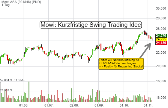 Mowi ist ein potenzieller Profiteur. Mehr Therapien im Kampf gegen COVID-19 machen neue Lockdowns oder Einschränkungen unwahrscheinlicher. Die Mobilität wird aufrechterhalten. Die Verbraucher fühlen sich sicherer und besuchen Gaststätten oder reisen in den Urlaub. Für Mowi ist das positiv, weil damit die Nachfrage nach Lachs wächst. Die Aktie könnte daher ein Swing Low bilden und mit den anderen Reopening Stocks anziehen.