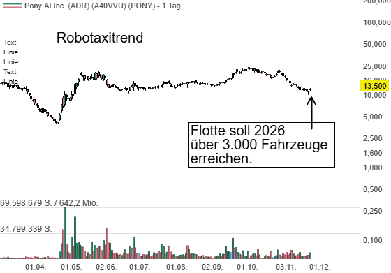 Pony AI setzt neue Maßstäbe in der Robotaxi-Industrie und hat nach einem strategisch wichtigen Profit-Meilenstein ambitionierte Wachstumsziele für 2026 ausgerufen. Das Unternehmen, das zu Chinas "Big Three" im autonomen Fahrdienst zählt, betreibt aktuell 961 Robotaxis und will die Marke von 1.000 Fahrzeugen bis Jahresende sicher übertreffen. Für 2026 plant CEO und Mitgründer James Peng, die Flotte auf mehr als 3.000 Einheiten auszuweiten – mehr als eine Verdreifachung. Rückenwind kommt von einem frühen Durchbruch in Guangzhou, wo die siebte Fahrzeuggeneration (Gen-7) erstmals stadtweit die Gewinnschwelle pro Fahrzeug erreicht hat. Der Umsatz sprang im dritten Quartal um 72 % auf 25,4 Mio. USD, während die Verluste – bedingt durch nahezu verdoppelte F&E-Aufwendungen – auf 61,6 Mio. USD anwuchsen.
