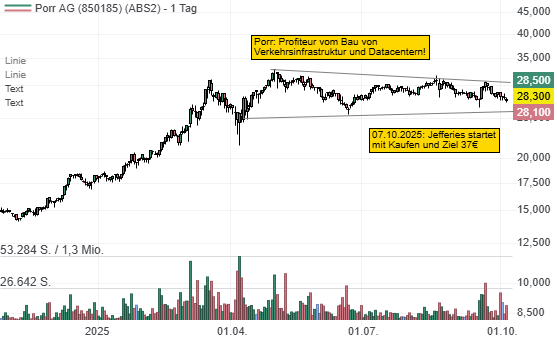 Die Bewertung ist nicht zu teuer. Andere Konzerne, wie Hochtief, liegen beim doppelten Multiple. Folglich starteten die Analysten von Jefferies heute mit "Kaufen" und einem Ziel von 37 Euro! Demnach unterschätze der Markt die Wachstumschancen für Porr in Mitteleuropa, vor allem wegen der starken Positionierung im Straßen- und Schienenbau. Europa investiert bekanntlich auch über das 5%ige NATO-Ausgabenziel mehr in Verkehrsinfrastruktur. Damit dürfte die Aktie innerhalb ihrer Seitwärtsrange wieder nach oben wegdrehen!