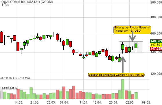 Die Technologie-Aktien absolvierten gestern Abend eine Rallye. Eine Fortsetzung der Erholung könnte heute bei Qualcomm zu einem neuen Long-Signal führen. Der Ausbruch aus der Pivotal Base um 151 USD könnte heute starten. Die Bewertung von Qualcomm ist mit einem 12er KGV moderat, zumal man das Wachstum auf eine breitere Basis stellt.