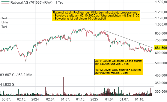 Rational strebt eine EBIT-Marge von 25 bis 26 % in diesem Jahr an. Das KGV beträgt 28, aber liegt bei Rational traditionell hoch wegen der Marktführerschaft und starken Profitabilität. Die UBS ist positiv gestimmt. Am 18.12.2025 stufte sie von Neutral auf Kaufen. Das Ziel wurde von 750 Euro auf 785 Euro erhöht. Während in Europa eine gute Aussicht auf Ersatzgeschäft gesehen werde, dürfte in den USA das Wachstum durch wichtige Abnehmer gestützt werden. Damit könnte es endlich zum Ausbruch aus der Korrektur kommen, was Rational auf der Long-Seite attraktiv macht.