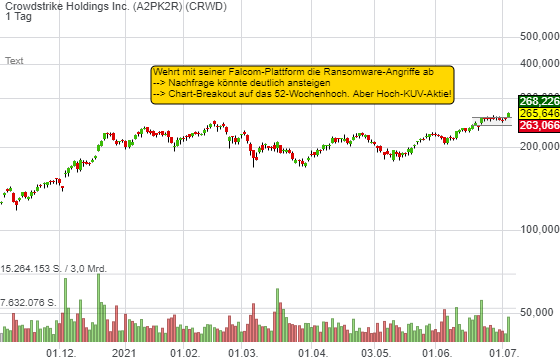 Die Aktie von Crowdstrike (CRWD) gehört in den USA zu den favorisierten Tech Stocks. Gestern entstand mit dem Vorstoß auf das 52-Wochenhoch ein neues Long-Signal. Was sind die Gründe?