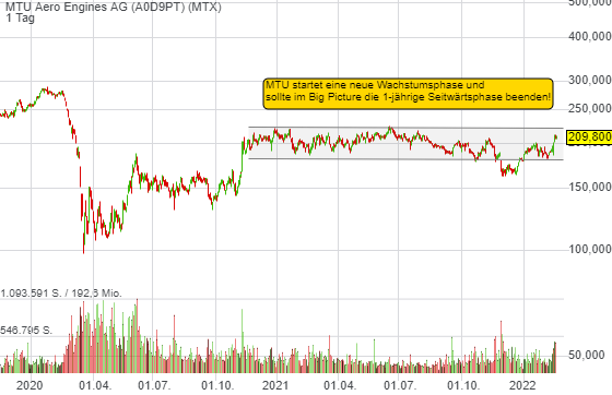 Der Qualitätswert MTU visiert den Big Picture-Breakout an. Ich denke die Chancen stehen gut, dass der Ausbruch über die kommenden Wochen gelingt.