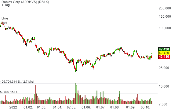 Eine dynamische Rebound-Bewegung sehen wir heute bei der Aktie der Game-Online-Plattform Roblox (RBLX) Der frische Impuls kommt hier mit den News zu den September-Daten, die das Unternehmen veröffentlicht hat. So stieg die Anzahl der täglich aktiven RBLX-Nutzer DAUs im Vergleich zum Vorjahreswert um 23 % auf 57,8 Millionen. Die Anzahl der gespielten Stunden erhöhte sich um 16 % auf 4 Milliarden. Die Bookings liegen nun bei +11/+15 % bei 212-219 Mio. USD.