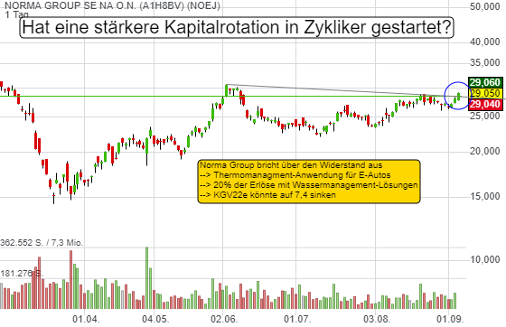Mit dem heftigen Shake-Out am Donnerstag nahm die Volatilität zu. Doch gleichzeitig ignorierten Zykliker diese Bewegung und gingen ihren eigenen Weg. Rotiert das Kapital von den Techs in die Zykliker? Warum die Norma Group dann ein Favorit wäre: