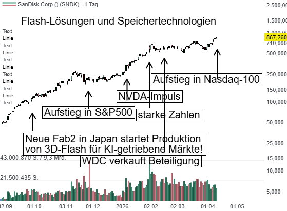 Die Aktie von SanDisk erhält einen neuen Kurstreiber: Der Flash-Speicherspezialist wird ab dem 20. April in den renommierten Nasdaq-100-Index aufgenommen. Die Börse reagiert prompt – das Papier legt zu, gestützt durch die Aussicht auf zusätzliche Nachfrage von Indexfonds und ETFs, die den Index nachbilden. Gleichzeitig muss der Softwareanbieter Atlassian seinen Platz räumen, nachdem dessen Aktie im laufenden Jahr um rund 65 % eingebrochen ist. Die Umschichtung unterstreicht die aktuelle Marktrotation: Kapital fließt zunehmend aus klassischen Softwarewerten ab und in Unternehmen, die direkt vom KI-Infrastrukturboom profitieren.