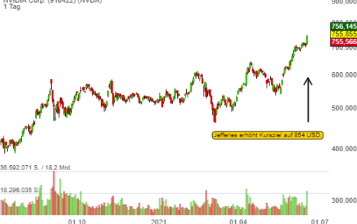 Jefferies hob das Kursziel für die Aktie des Chipherstellers Nvidia (NVDA) von 740 auf 854 USD. Laut Marketwatch und FactSet ist dies nun die höchste Bewertung des Unternehmens. Daher auch kein Wunder,...