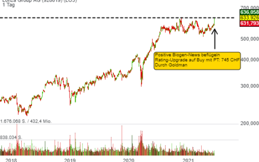 Einen sehr schönen charttechnischen Big-Picture-Breakout auf ein neues Jahreshoch haben wir heute bei Lonza. Der entscheidende Impuls kam heute mit dem Rating-Upgrade von Neutral auf Buy samt einer Kurszielerhöhung...