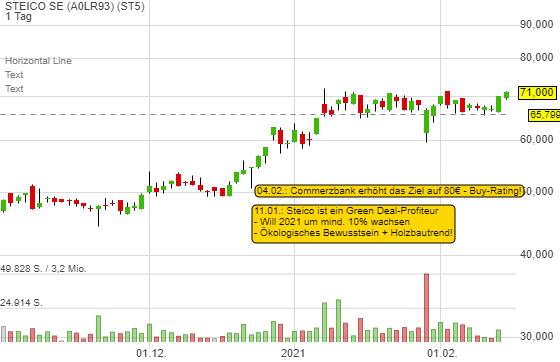 Steico peilt 2021 ein Wachstum von mindestens 10% an. Mit einem KGV von 30 und KUV von 2,6 ist die Bewertung nicht günstig, aber die strukturellen Treiber ermöglichen weiteres Wachstum. Die Aktie könnte nun in Richtung 80 Euro ausbrechen.