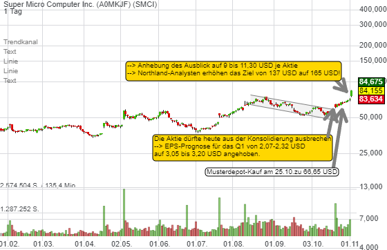 Die Aktie von Super Micro Computer stürmt heute um 17 % nach oben und wir sind im US-Musterdepot bei TraderFox dabei. Unser Kauf erfolgte am 25.10 zu 66,65 USD. Warum hebt die Aktie jetzt ab?