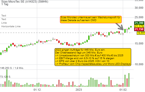 Der Chipausrüster Süss Microtec gehört zu den trendstärksten Werten am deutschen Markt und steht am 52-Wochenhoch. Am 02.02.23 fand der Kapitalmarkttag statt und die Ziele bis 2025 wurden bestätigt. Die EBIT-Marge soll von 8,5 bis 10 % auf 15 % zulegen. Netto würde das Ergebnis auf über 2 Euro je Aktie steigen. Das KGV wäre bei rund 10.