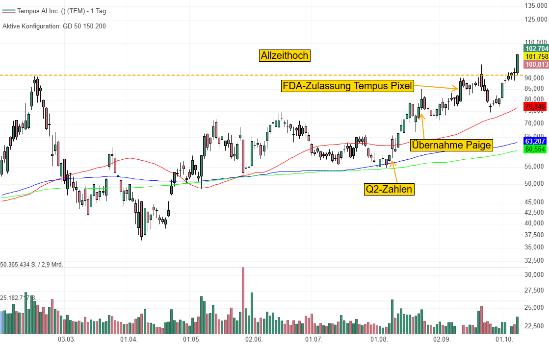 Das 2. Quartal lieferte ein Umsatzplus von knapp 90 %, getrieben vom Genomik-Geschäft mit +115 %. Hier beschleunigte sich das Volumenwachstum bei Onkologie-Tests von 20 auf 26 %. Auch die Übernahme von Ambry Genetics für erblich bedingte Krebstests ist ein Treiber. Im Fiskaljahr 2025 will Tempus AI erneut um 82 % auf 1,26 Mrd. USD wachsen. Die Aktie startet mit einem Ausbruch auf ein neues Allzeithoch den Big-Picture-Breakout.