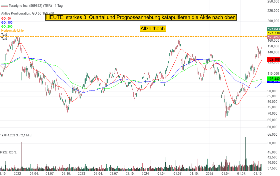 Auch die Evercore ISI-Analysten hoben für 2026 bereits ein "erhebliches Aufwärtspotenzial" durch das Umsatzwachstum im Bereich Compute und HBM-Tests sowie den guten Aussichten in der Industrieautomation hervor. Die Experten von Susquehanna verwiesen im September mit einem Kursziel von 200 USD (Positive) auf verbesserte Beziehungen zu TSMC, wo Teradyne im Bereich des Wafer-Sort-Testings für GPUs deutlich an Bedeutung gewinnt. TSMC plant, ab 2026 SoC-Tester von Teradyne zu erwerben und weitere Einheiten an OSAT-Partner zu liefern. Bei der Aktie deutet sich mit einem Kursplus von über 20 % der Big-Picture-Breakoutversuch auf ein neues Allzeithoch an.