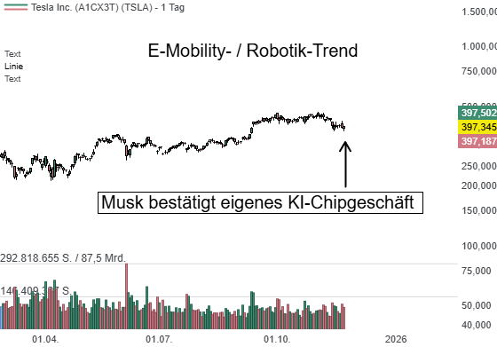 Tesla verfügt laut CEO Elon Musk über ein eigenes, seit Jahren aktives Entwicklungsteam für KI-Chips und Platinen. Dieses habe bereits "mehrere Millionen" eigener KI-Chips für Teslas Fahrzeuge und Rechenzentren entworfen, die das Rückgrat von Teslas selbstfahrenden Systemen bilden und entscheidend für den Anspruch seien, führend in "Real-World-AI" zu sein. Die Aussage stützt am Montag die Tesla-Aktie, die zuletzt wegen der allgemeinen Schwäche im KI-Sektor unter Druck stand. Die strategische Bedeutung eines eigenen Chipgeschäfts ist potenziell enorm – NVIDIA verdankt seinen Börsenerfolg genau dieser Fähigkeit und dem starken Nachfrage-Momentum. Tesla nutzt dagegen seine Chips derzeit für eigene autonome Fahrzeuge und das Training der KI in eigenen Rechenzentren. Langfristig will Musk die Chipkompetenz kommerziell über selbstfahrende Autos und humanoide Roboter wie "Optimus" monetarisieren. Er betonte zudem, dass diese Technologie künftig Millionen Leben retten und den Zugang zu fortschrittlicher medizinischer Versorgung verbessern könne – und warb gleichzeitig um neue Talente für Teslas KI-Chipteam. Und dies dürfte zukünftig sowohl eine neue Umsatzquelle eröffnen als auch eine berechtigte Wachstumsfantasie entfachen!