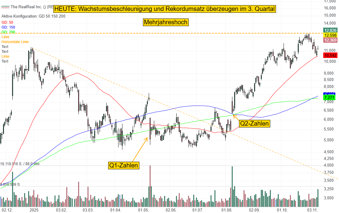Das 3. Quartal zeigt eine anhaltende Wachstumsbeschleunigung auf 17 % mit Rekorderlösen auf. Auch das Bruttowarenvolumen (GMV) erreichte mit +20 % auf 520 Mio. USD. Positiv war die Entwicklung beim bereinigten EBITDA mit 9,3 Mio. USD mit einer von 1,6 % auf 5,4 % verbesserten Marge. Eine angehobene Jahresprognose signalisiert ein Wachstum von bis zu 15 % auf 687 bis 690 Mio. USD. Ebenso dürfte das EBITDA mit 37,7 bis 38,7 Mio. USD (zuvor 29 bis 32 Mio. USD) deutlich besser ausfallen. Mit einem nachbörslichen Kursplus von über 12 % könnte nun der Breakoutversuch auf ein neues Mehrjahreshoch gestartet werden.