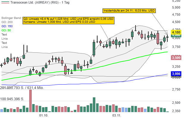 Am 29. Oktober wurde der Q3-Bericht veröffentlicht. Obwohl Transocean einen Nettoverlust von beachtlichen 1,92 Mrd. USD verzeichnete, was einem Verlust von 2,00 USD pro verwässerter Aktie entspricht, wurde dieses Ergebnis maßgeblich durch nicht-operative Sonderposten beeinflusst. Insbesondere ein Verlust aus Wertminderung von Vermögenswerten in Höhe von 1,908 Mrd. USD (netto nach Steuern) und ein Verlust aus der Wandlung von Schulden in Eigenkapital von 75 Mio. USD drückten das Ergebnis. Bereinigt um diese Einmaleffekte, übertraf das Unternehmen jedoch die Erwartungen der Analysten und erzielte einen bereinigten Gewinn von 0,06 USD pro Aktie. Als positiver Einflussfaktor zeigte sich die operative Effizienz, die im dritten Quartal 97,5 % erreichte und damit über den 96,6 % des Vorquartals und den 94,5 % des Vorjahres lag. Dies deutet auf eine starke Leistung der aktiven Flotte hin, während der Gesamtauftragsbestand zum Stichtag Oktober 2025 bei soliden 6,7 Mrd. USD verharrte.