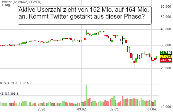 Twitter ist eine der ersten Anlaufstellen, wenn es um Echtzeit-Informationen geht. Auch in der COVID-19-Pandemie zog die Nutzung laut Unternehmensangaben deutlich an. Das führte dazu, dass sich die Zahl aktiver Nutzer seit Jahresbeginn von 152 Millionen auf 164 Millionen erhöhte. Kurzfristig ist das Werbeumfeld eingetrübt. Die Q1-Guidance wurde angepasst. Doch dürfte Twitter sogar gestärkt aus dieser Phase hervorgehen. Die Userbase und Verweildauer auf Twitter steigen. Das macht die Plattform für Werbekunden sogar attraktiver. Damit könnte das Wachstum auf mittelfristige Sicht einen Schub erhalten. Die Aktie müsste nun beginnen dies einzupreisen.