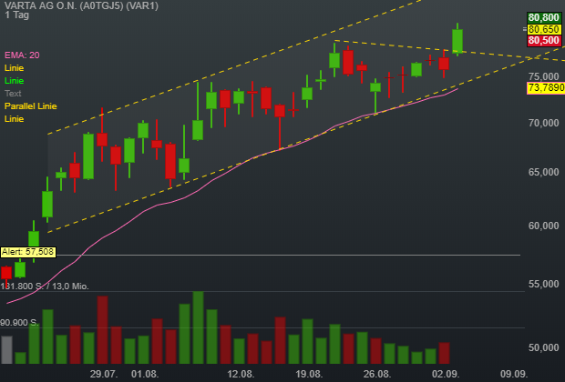 Die Aktie profitiert heute durch Analysten-Support von der Commerzbank. Das Kursziel wurde von 80€ auf 110€ angehoben. Wir können dem Bullen am deutschen Aktienmarkt prozyklisch folgen