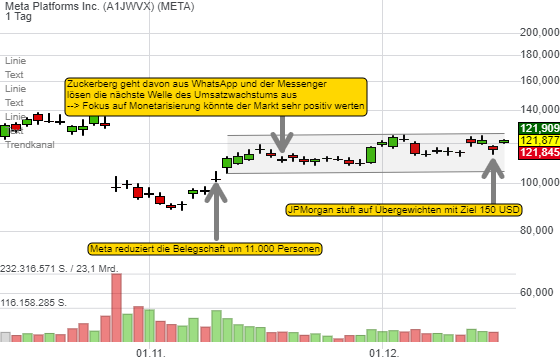 Zweitens hat Meta zwei bedeutende Schritte eingeleitet, welche das Vertrauen in den Titel stärken sollten. Das Unternehmen beginnt mehr Wert auf die Kostendisziplin zu legen und baut die Belegschaft ab. Darüber hinaus werden Whatsapp und der Messenger die nächste Welle des Umsatzwachstums einleiten. Bei Whatsapp gilt es 2 Mrd. User zu monetarisieren.