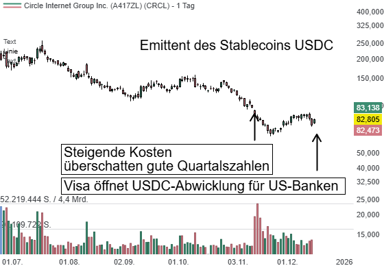 Visa ermöglicht US-Banken ab sofort, Transaktionen mit dem Zahlungsnetzwerk über den Stablecoin USDC abzuwickeln, und setzt damit ein starkes Signal für die institutionelle Nutzung digitaler Währungen. Die Initiative ist Teil eines Pilotprogramms für Stablecoin-Abrechnungen und soll schnellere Geldbewegungen, eine Verfügbarkeit an sieben Tagen pro Woche sowie eine höhere operative Stabilität auch an Wochenenden und Feiertagen bieten. Während die Visa-Aktie leicht nachgibt, rückt Circle Internet Group als sehr wahrscheinlicher Gewinner in den Fokus der Anleger: Circle ist Emittent von USDC, dem weltweit zweitgrößten Stablecoin, und entwickelt zudem eine eigene Blockchain, wobei Visa als strategischer Designpartner auftritt.