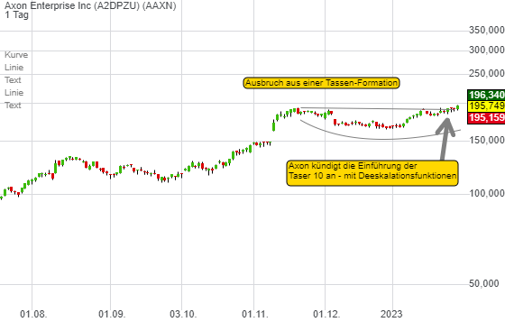 Der Taser 10 kann einen neuen Upgrade-Zyklus einleiten. Oft ist es etwas "Neues", was Wachstumsaktien weiter anschiebt. Die Axon Enterprise-Aktie reagiert auf die Markteinführung mit einem Ausbruch aus der Tassen-Formation!