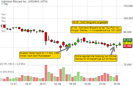 Mit einem KGV von 19 ist die Bewertung moderat. Der Konzern hat über 400 Mio. aktive Gamer und das Ziel ist auf 1 Mrd. zu kommen. Denn Gaming ist ein Top-Unterhaltungsprodukt und die Verbraucher werden mehr Geld für digitale Items ausgeben. Dazu wird man die Franchise um Diablo, WoW und Overwatch nach dem Vorbild von Call of Duty ausbauen, indem es eine mobile Version und regelmäßig neuen Content gibt, der die User bindet. Der nette Nebeneffekt wird sein, dass die 33%ige Marge der Blizzard-Sparte in Richtung der 46% in der Activision-Sparte zulegen wird. Daher kann auf mittelfristige Sicht eine Gewinnüberraschung entstehen. Die nächsten Trigger sind die Releases von CoD Vanguard, Diablo II Resurrected am 23.09. und der mobilen Diablo-Version im ersten Halbjahr 2022.