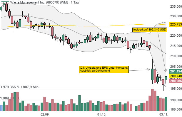 Am 27. Oktober hat der Konzern den Bericht für das 3. Quartal präsentiert. Demnach ist der Umsatz im Vergleich zum Vorjahreszeitraum um 14,9 % auf 6,443 Mrd. USD gestiegen und beim EPS gab es einen Anstieg um 1 % auf 1,98 USD. Im Kerngeschäft Sammlung und Entsorgung wurde sogar eine rekordverdächtige bereinigte operative EBITDA-Marge von 38,4 % erzielt. Eine aggressive Preisdisziplin führte im Segment Sammlung und Entsorgung zu einem "Core Price" von 6,0 % und trug damit zur Umsatzsteigerung bei. Eine Belastung stellen hingegen die Recycling-Rohstoffpreise dar. Dies unterstreicht die Effizienz der strategischen Technologieinvestitionen und der disziplinierten Preisgestaltung des Unternehmens. Die Experten hatten auf der anderen Seite mit einem Umsatz in Höhe von 6,50 Mrd. USD und EPS in Höhe von 2,02 USD kalkuliert.