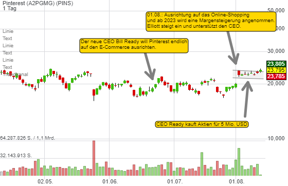 Wenn es dem Unternehmen gelingt eine intuitive Shopping-Funktion zu implementieren, kann das Social Commerce-Geschäft groß werden. Der neue CEO Bill Ready, der zuvor bei Google und Paypal war, sollte das Know How haben. Er kaufte jüngst Pinterest-Aktien für 5 Mio. USD und wird auch vom neuen aktivistischen Investor Elliott unterstützt. Paypal könnte bei der Zahlungsabwicklung helfen. Eine Kooperation kann Elliott anbahnen, die sich auch bei Paypal einkauften. Wenn Pinterest ab 2023, wie angekündigt, die Marge steigert und die Shopping-Funktion bringt, die nicht bloß auf Drittanbieterseiten verlinkt, kann die Aktie ein großes Comeback starten.