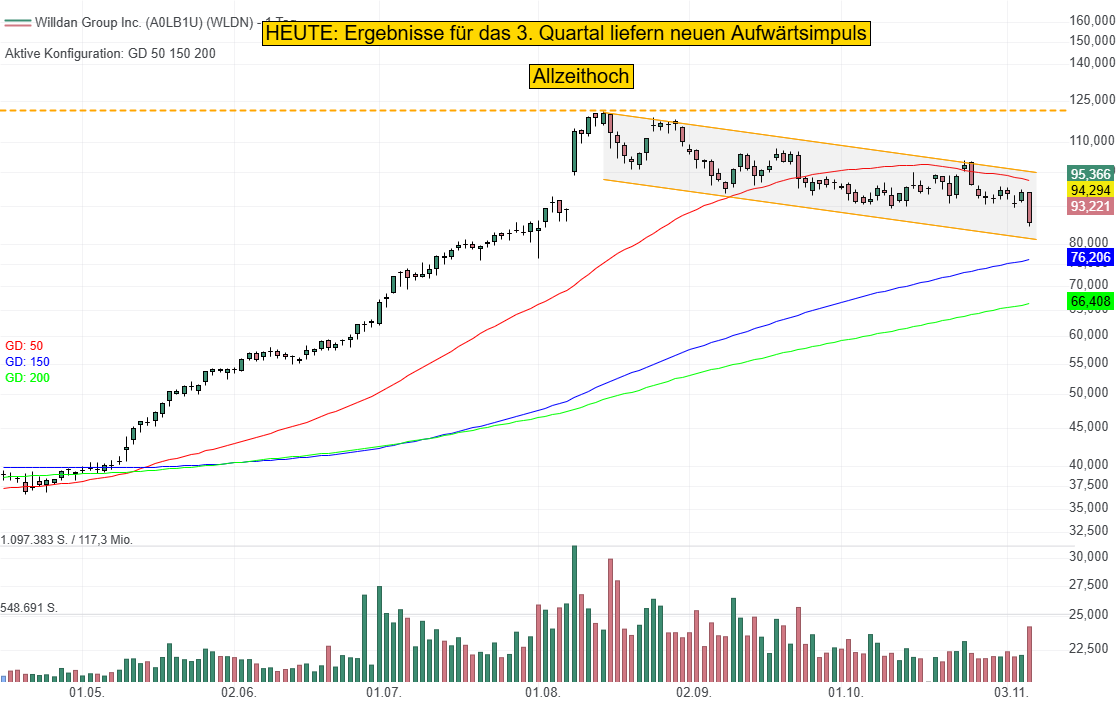 Das 3. Quartal überzeugte mit einem Umsatzplus von 25,5 % auf 95 Mio. USD (Konsens: 86,3 Mio. USD). Zudem konnte der Nettogewinn um 66 % auf 1,21 USD je Aktie (Konsens: 0,81 USD) gesteigert werden. Die Umsatzprognose für das Fiskaljahr 2025 hob das Management von 340 bis 350 Mio. auf 360 bis 365 Mio. USD an. Auch der Nettogewinn soll statt 3,50 bis 3,65 USD nun 4,10 bis 4,20 USD je Aktie betragen. Die Aktie konnte seit dem Jahresstart bereits mit einer Performance von rund 125 % überzeugen. Nachdem Mitte August ein Allzeithoch markiert wurde, zeichnet sich eine Konsolidierungsbewegung ab, die nun mit der Zurückeroberung des GD 50 und dem Ausbruch aus dem Abwärtstrend wieder beendet werden könnte.