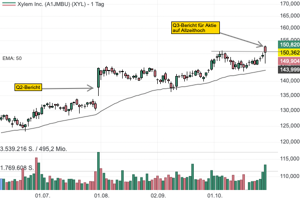Die Aktie befindet sich in einem langjährigen Aufwärtstrend, wobei die Q3-Zahlen zu einem Ausbruch auf ein neues Allzeithoch führten. Bei einem Einstieg könnte man das Risiko im Bereich von 145 USD begrenzen, was einem Risiko von knapp 4 % entspricht. (XYL)