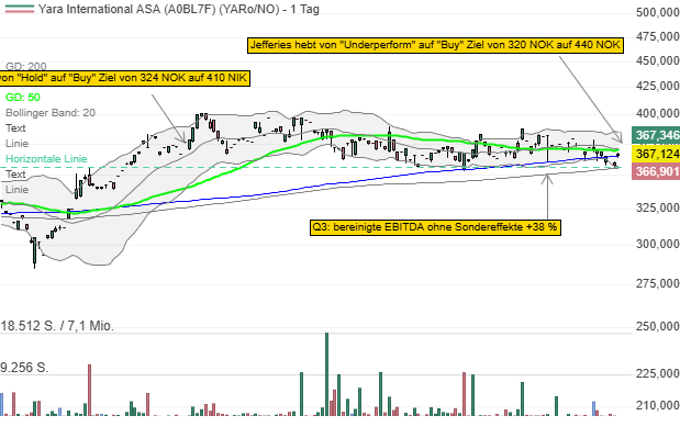 Jefferies hat Yara International am 11. November von "Underperform" auf "Buy" um zwei Stufen angehoben. Das Kursziel wurde gleichzeitig von 320 auf 440 NOK adjustiert. In Europa bevorzuge der Analyst die Hersteller von Nitratdünger wie Yara gegenüber denen von Kalidünger wie K+S, schrieb der neue zuständige Analyst Marcus Dunford-Castro in seiner Branchenbetrachtung. Die Nitratdüngerknappheit lasse die Preise steigen und halte die Nachfrage stabil. Dagegen fehle bei Kalidünger die politische Unterstützung, und die erhöhten Investitionen beschränkten die Barmittelausschüttungen.