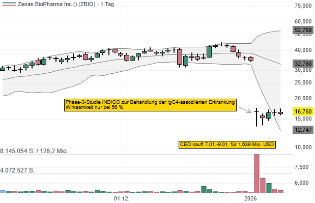 Die fundamentalen Chancen bleiben intakt. Zenas plant den FDA-Antrag für das 2. Quartal 2026 und den EMA-Antrag für die 2. Jahreshälfte. Sollten diese Zulassungen erfolgen, stünde Zenas ein First-Mover-Vorteil in Europa und eine starke Alternative in den USA offen, insbesondere für Patienten, die eine Selbstinjektion bevorzugen. Darüber hinaus bietet die Pipeline weiteres Kurspotenzial jenseits der IgG4-RD. So werden für das 4. Quartal 2026 wichtige Phase-2-Daten zu SLE erwartet. Gelingt es Zenas, in diesen volumenstarken Indikationen zu überzeugen, könnte der aktuelle Kursrücksetzer rückblickend als Überreaktion des Marktes und attraktive Einstiegschance gewertet werden, sofern die Liquidität bis zur Kommerzialisierung gesichert bleibt. Ein starkes Vertrauenssignal setzte CEO Leon O. Moulder Jr.: Er nutzte den Kursrutsch zwischen dem 7. und 9. Januar für Insiderkäufe im Wert von rund 1,64 Mio. USD (Kaufkurse: 16,30–16,55 USD) und erhöhte seinen Bestand auf 366.155 Aktien.