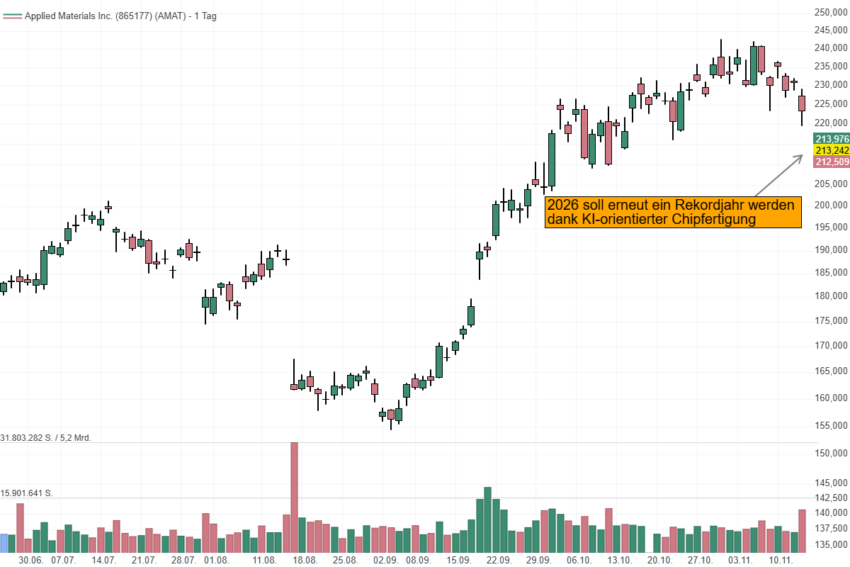 Applied Materials blickt nach einem starken Abschluss des Geschäftsjahres 2025 zuversichtlich auf 2026. Das Unternehmen sieht sich gut positioniert, um vom wachsenden Bedarf an KI-fähigen Halbleitern zu profitieren – insbesondere bei fortschrittlicher Logikfertigung in Chipfabriken und bei modernem Arbeitsspeicher (DRAM). Applied Materials entwickelt und baut Anlagen, mit denen Chipfabriken ihre Halbleiter überhaupt erst herstellen und die einzelnen Fertigungsschritte präzise steuern können.