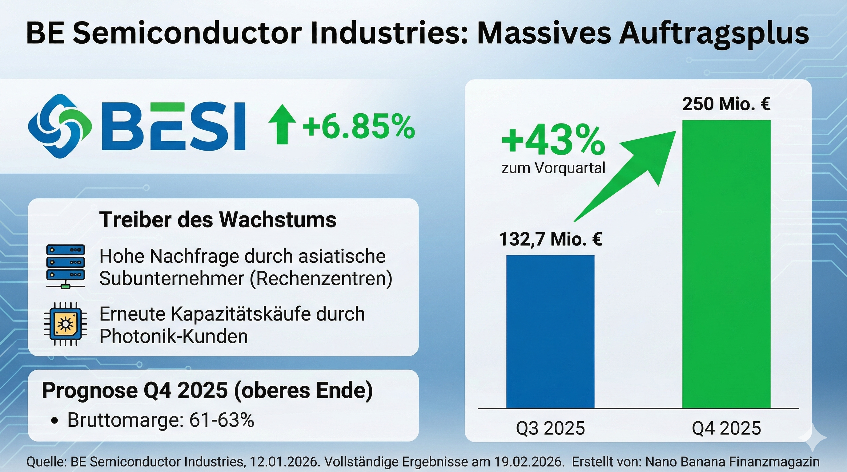 Der niederländische Zulieferer von Montageanlagen für die Halbleiterindustrie teilte am 12.01.2026 mit, dass sich die Aufträge für das 4. Quartal auf 250 Mio. Euro beliefen. Dies entspricht mehr als einer Verdoppelung gegenüber dem Vorjahreszeitraum und einem Anstieg von 43 % im Vergleich zum 3. Quartal.