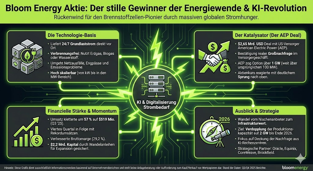 Bereits im jüngsten Quartal präsentierte Bloom glänzende Zahlen. Der Umsatz kletterte um 57 % auf 519 Mio. USD, die Bruttomarge verbesserte sich, und das Unternehmen lieferte das vierte Quartal in Folge Rekordumsätze. CEO KR Sridhar sprach von einem entscheidenden Jahr für die Positionierung im Ausblick auf 2026. Besonders wichtig für Investoren ist, dass die Produktionskapazität bis Ende 2026 auf 2 GW verdoppelt werden soll, um der hohen Nachfrage aus KI-Rechenzentren und Industrie-Apps gerecht zu werden. Gleichzeitig sicherte sich Bloom neue strategische Kundenbeziehungen, darunter Oracle, Equinix, AEP, CoreWeave und Brookfield. Durch die Ausgabe von 2,2 Mrd. USD an Nullkupon-Wandelanleihen verschaffte sich das Unternehmen zudem Kapital für Expansion, ohne operative Projekte auszubremsen.