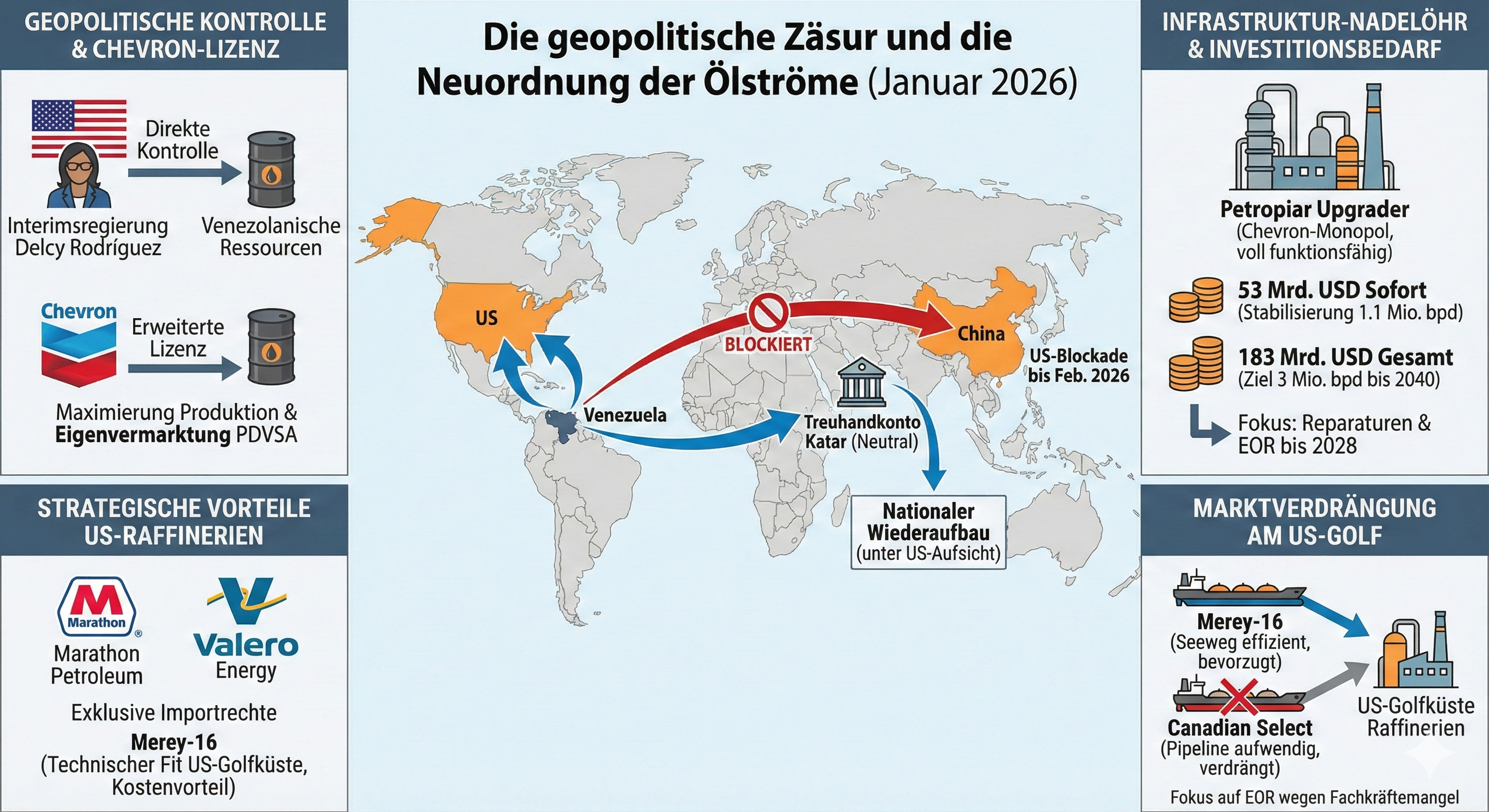 Die Infografik visualisiert die radikale geostrategische Neuausrichtung der venezolanischen Ölströme im Januar 2026, durch die China als Hauptabnehmer zugunsten der US-Golfküste und dortiger Raffinerien verdrängt wird. Sie verdeutlicht dabei die Monopolstellung von Chevron sowie den enormen Investitionsbedarf von über 180 Mrd. USD, der für die Wiederbelebung der maroden Infrastruktur notwendig ist.