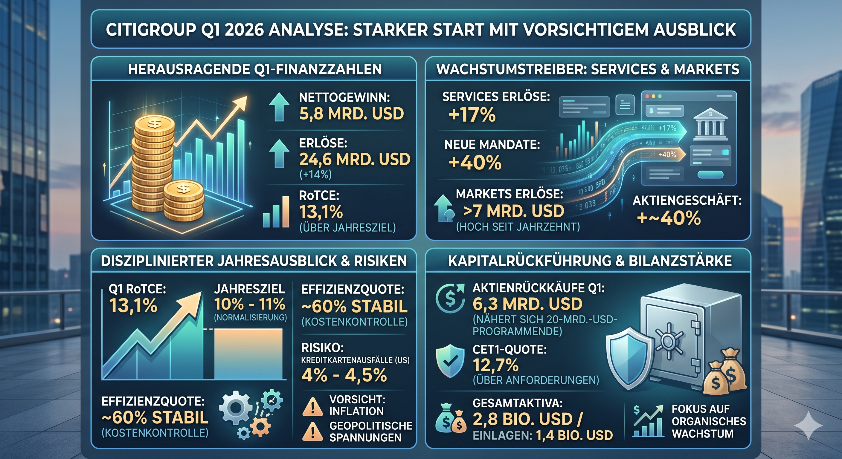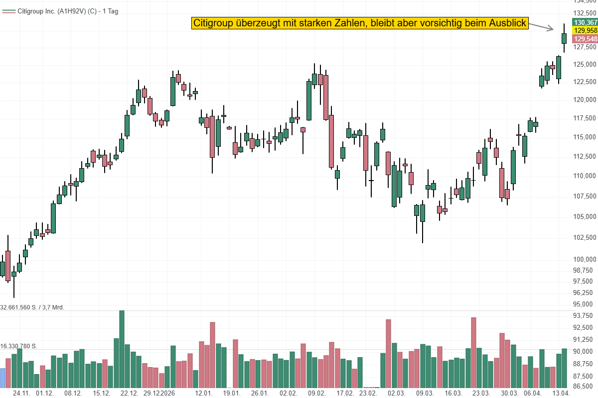 Die Citigroup ist mit einem überraschend starken ersten Quartal in das Jahr 2026 gestartet und liefert ein deutliches Signal operativer Stärke. Der Nettogewinn lag bei 5,8 Mrd. USD, während die Erlöse um 14 % auf 24,6 Mrd. USD zulegten. Besonders bemerkenswert ist der RoTCE von 13,1 %, also die Rendite auf das eingesetzte materielle Eigenkapital, die bereits über dem angestrebten Jahresziel liegt. CEO Jane Fraser sprach von einem "außergewöhnlich starken Start", betonte jedoch zugleich, dass ein einzelnes Quartal keine Garantie für das Gesamtjahr sei. Trotz der positiven Dynamik bleibt das Management daher vorsichtig und verweist auf ein weiterhin anspruchsvolles makroökonomisches Umfeld.