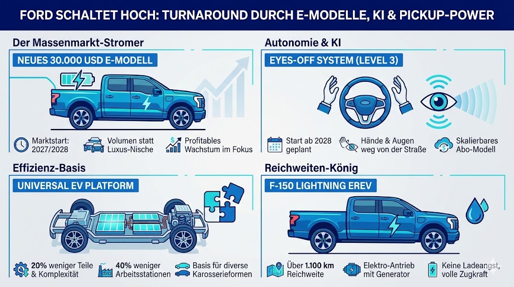 Ford zieht die Reißleine bei teuren, wenig profitablen Elektroprojekten und startet gleichzeitig einen zweiten, strukturierteren Anlauf in Richtung EV und Autonomie. Mit einem 30.000 USD-Stromer, der Universal EV Plattform, dem Eyes-Off-System und dem F-150 Lightning EREV setzt der Konzern auf bezahlbare Technik, echte Alltagstauglichkeit und Margenfokus statt reiner Imageprodukte. Die nächsten Jahre werden zeigen, ob Ford den Spagat zwischen Umbau, Investitionen und Gewinnzielen schafft. Gelingt er, könnte aus dem aktuellen Umbau eine der spannendsten Turnaround-Stories im Autosektor werden.